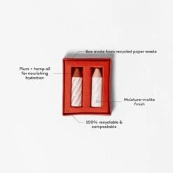 The product is: Set of two multi-use crayons for eyes, lips, and cheeks. Totally plastic free!