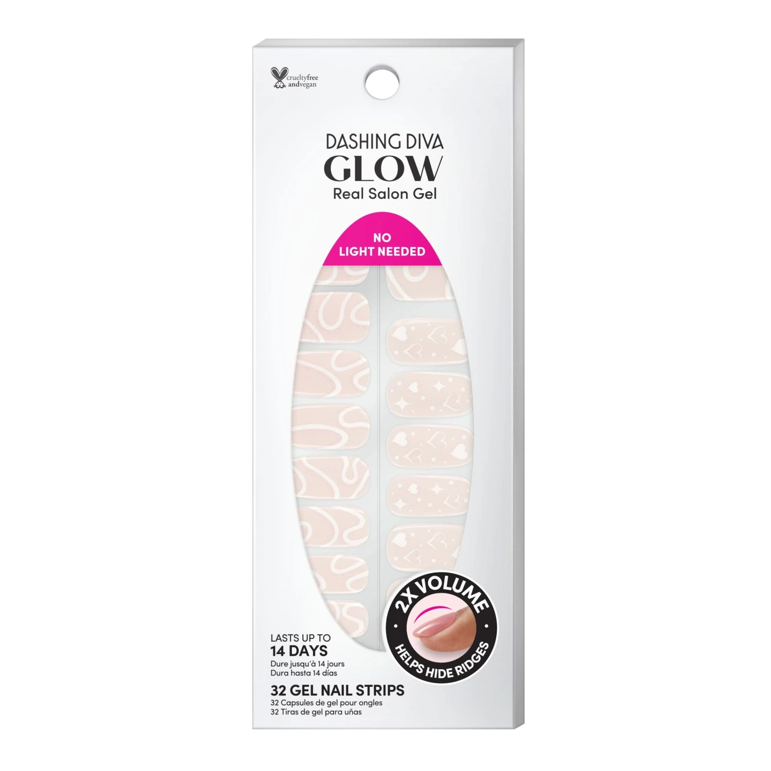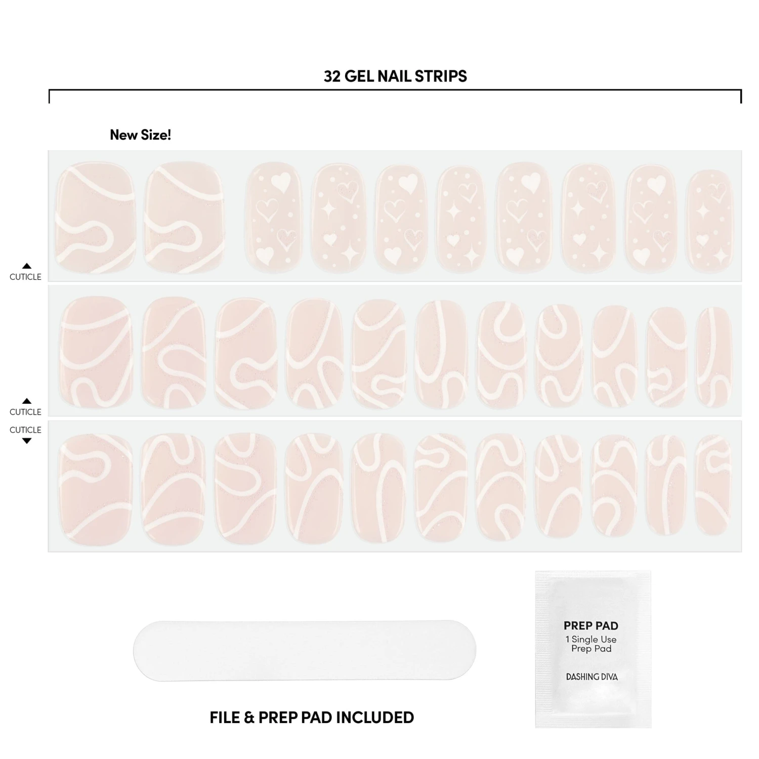 A Sheer nude pink gel nail strips featuring abstract waves, heart accents, and iridescent glitter with a double gel formula for a smooth finish!