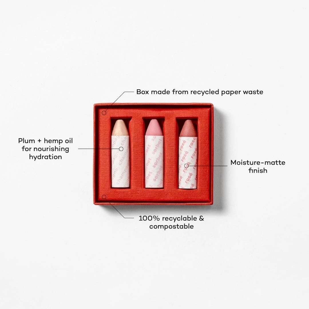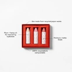 This Product Is: A set of three multi-use crayons for eyes, lips, and cheeks. Totally plastic free!