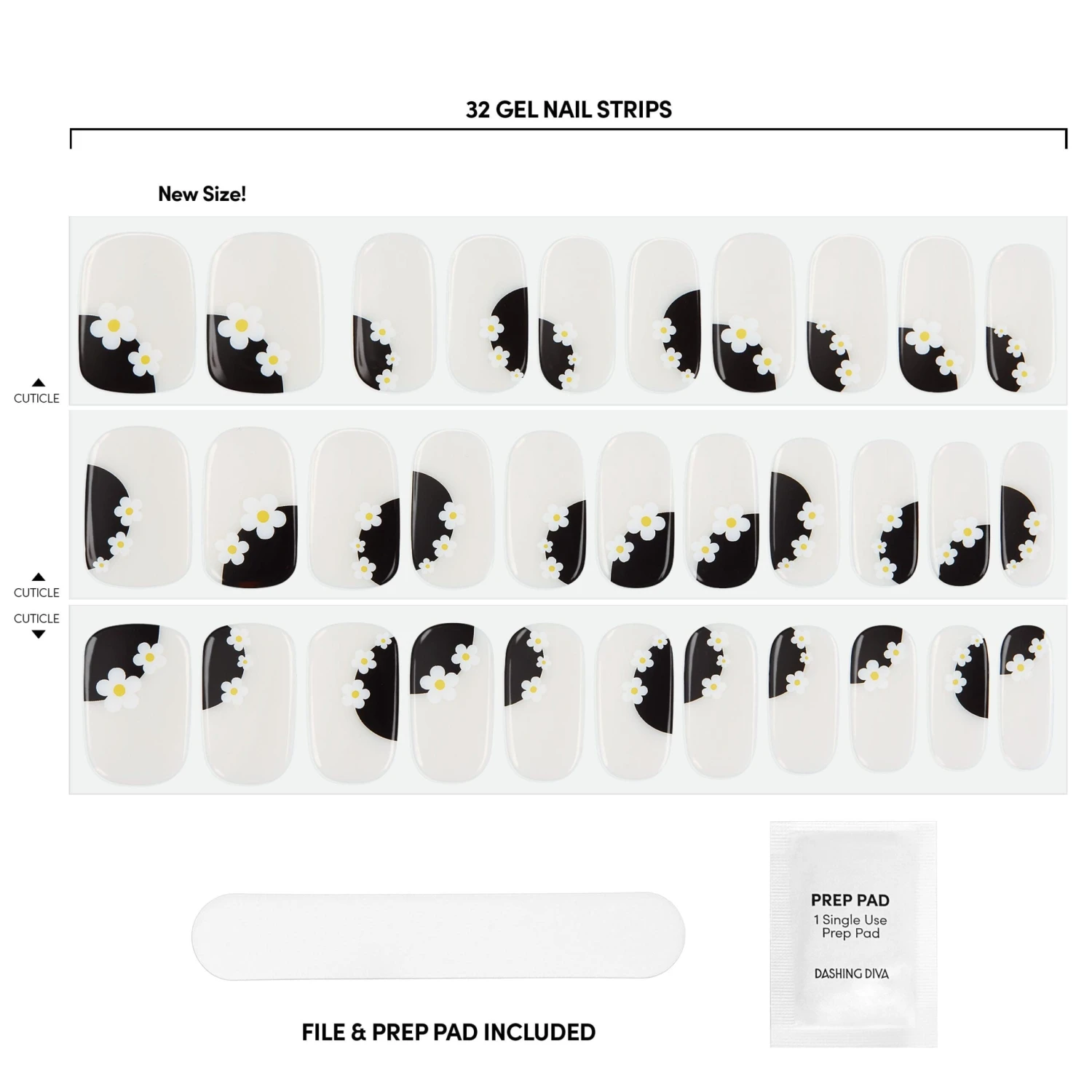 Nude and black gel nail strips featuring daisy accents with a double gel formula for a smooth finish!