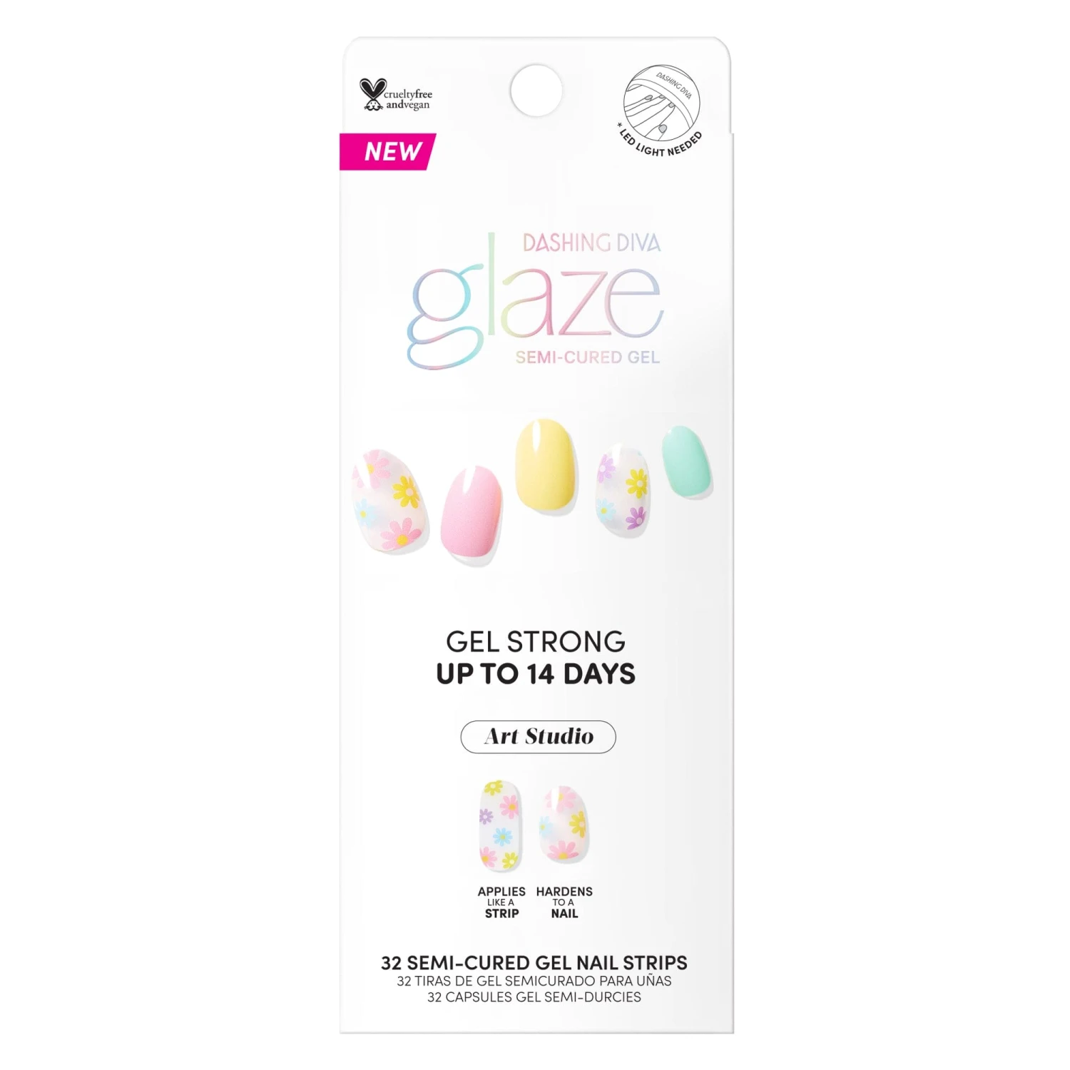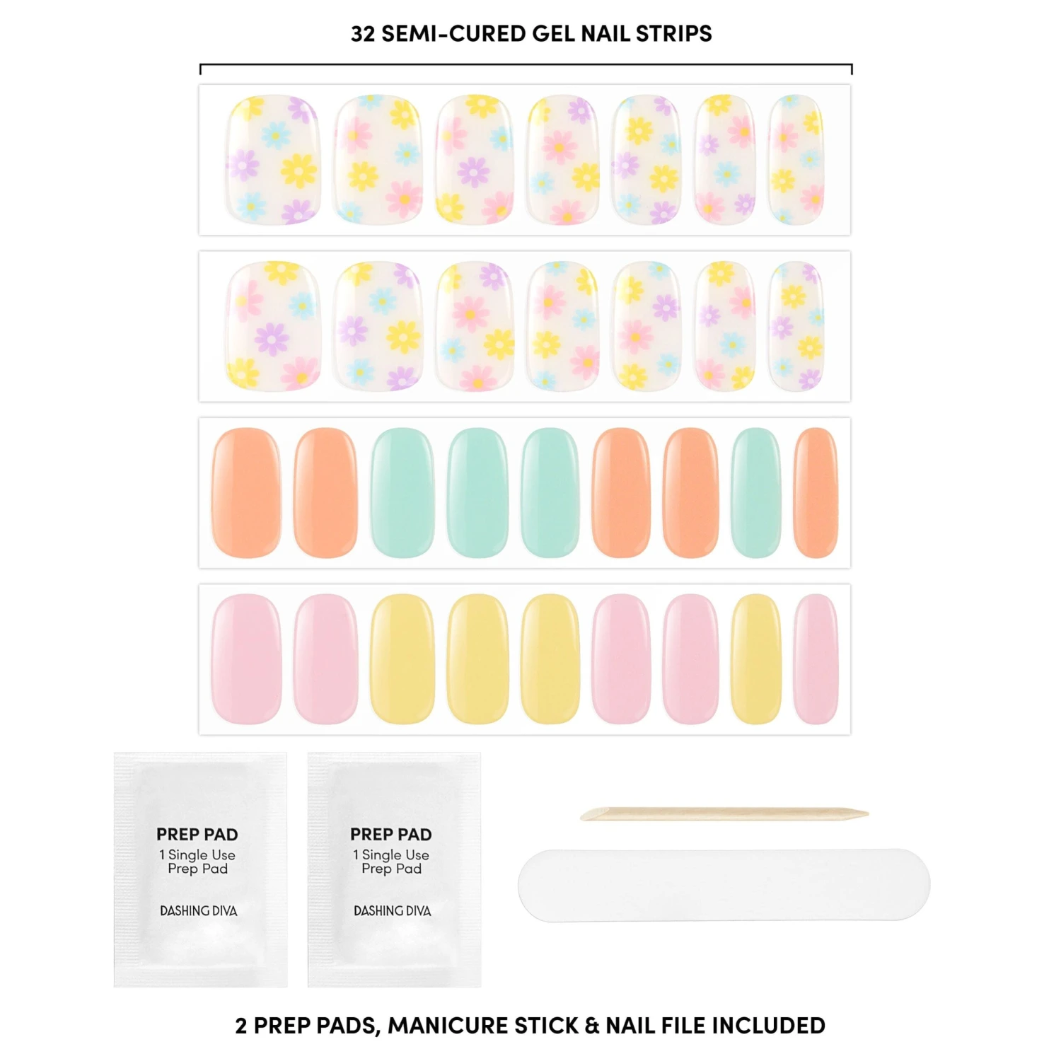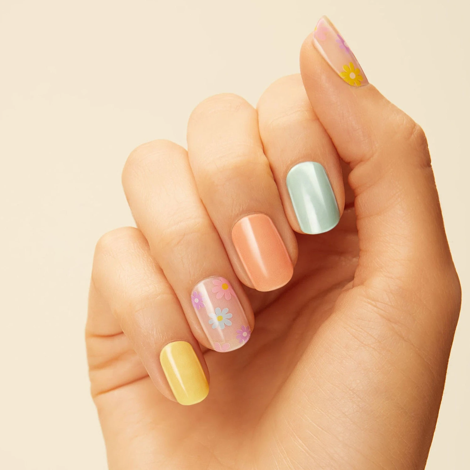 Semi-cured pink, yellow, and turquoise gel nail strips featuring daisy accents with mega volume & maximum shine.Â