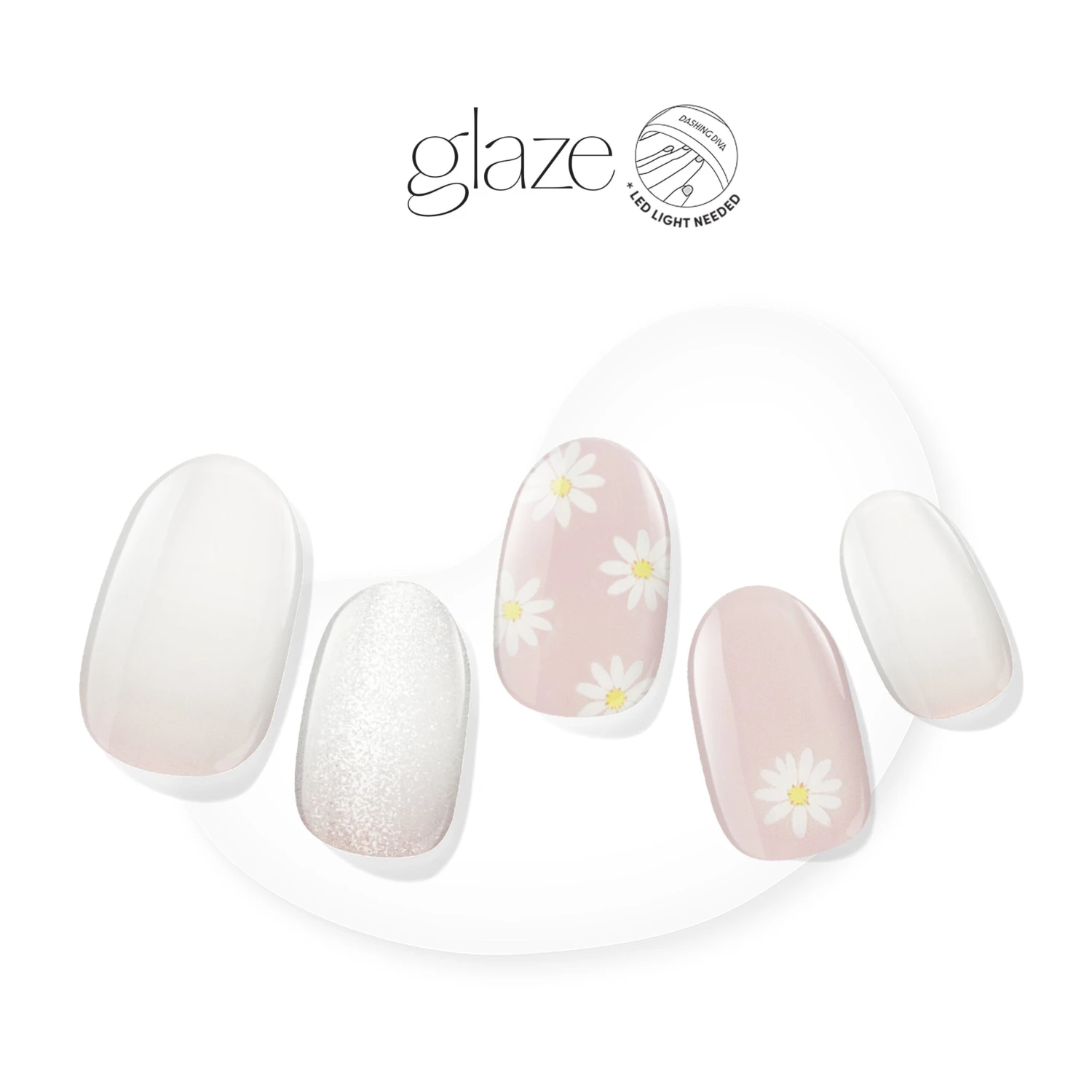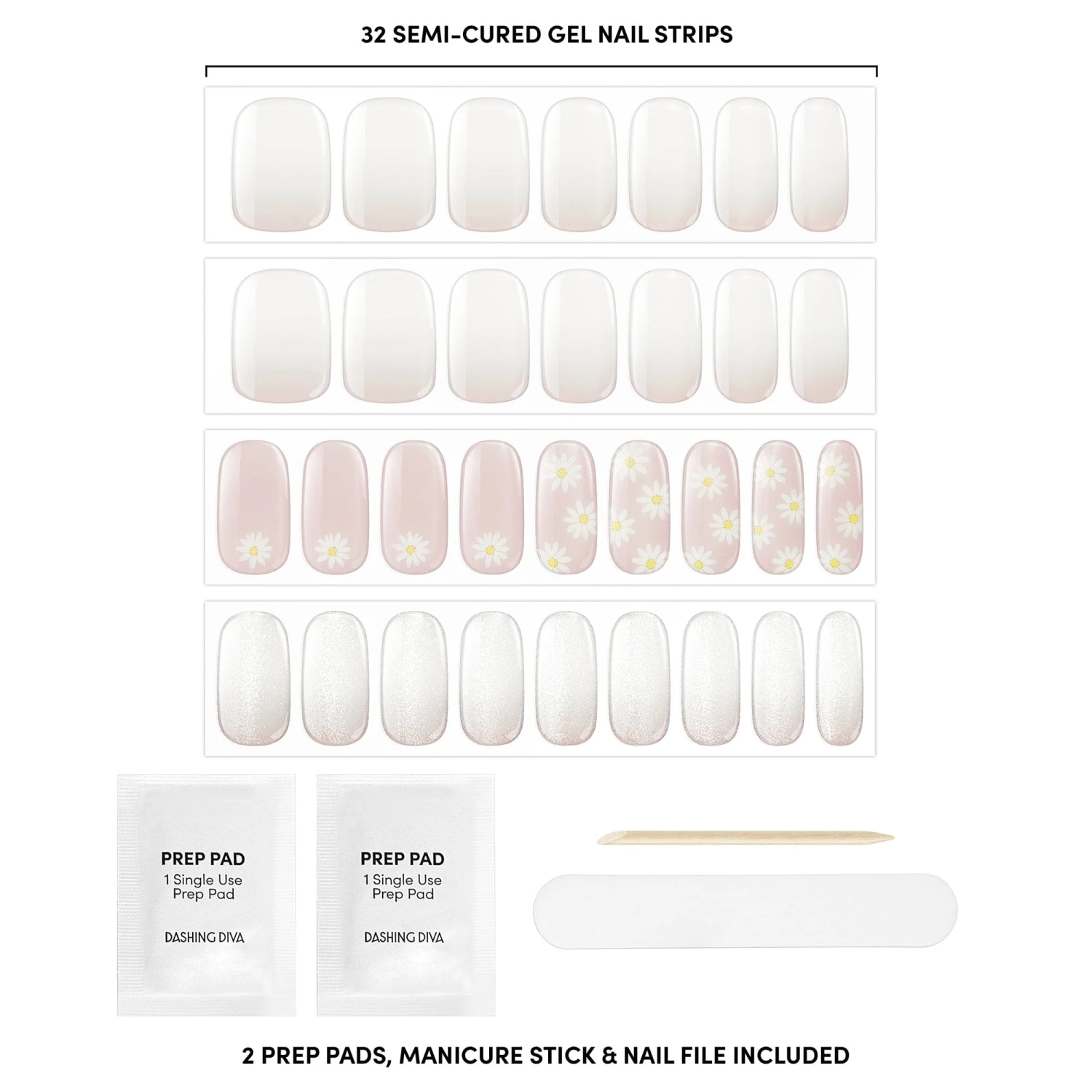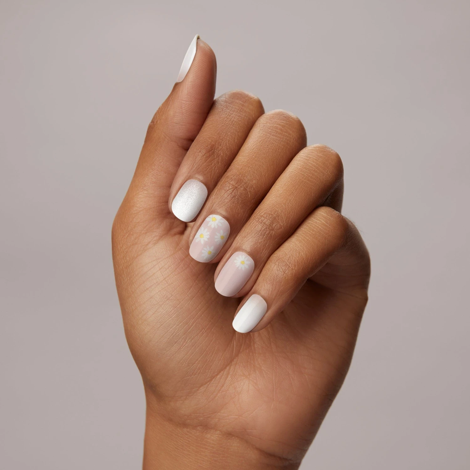 The next generation of florals. Semi-cured sheer nude & ombré white gel nail strips featuring daisy nail art and a silver velvet shimmer effect with mega volume and maximum shine.