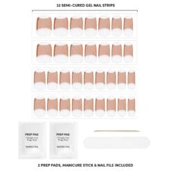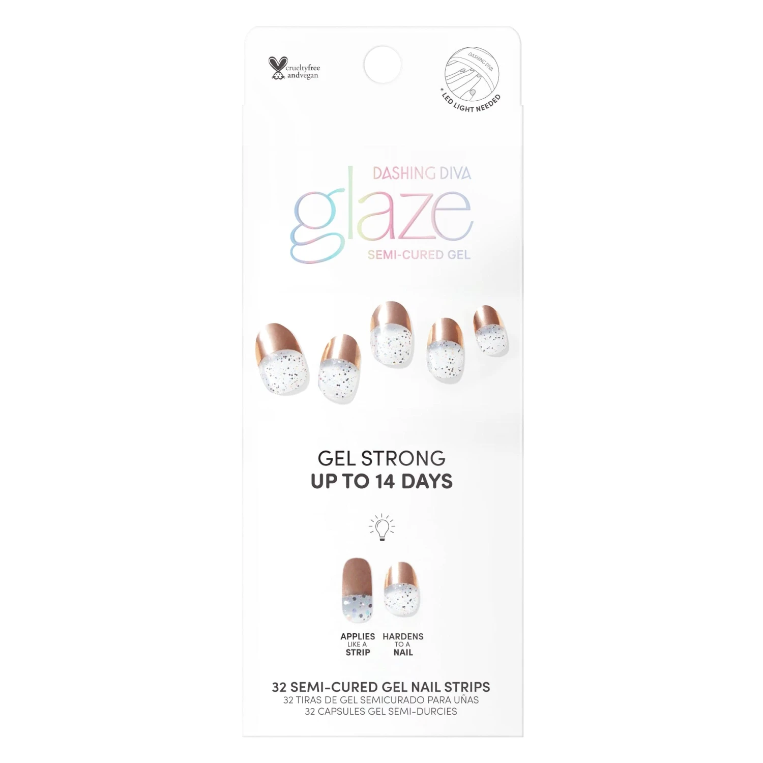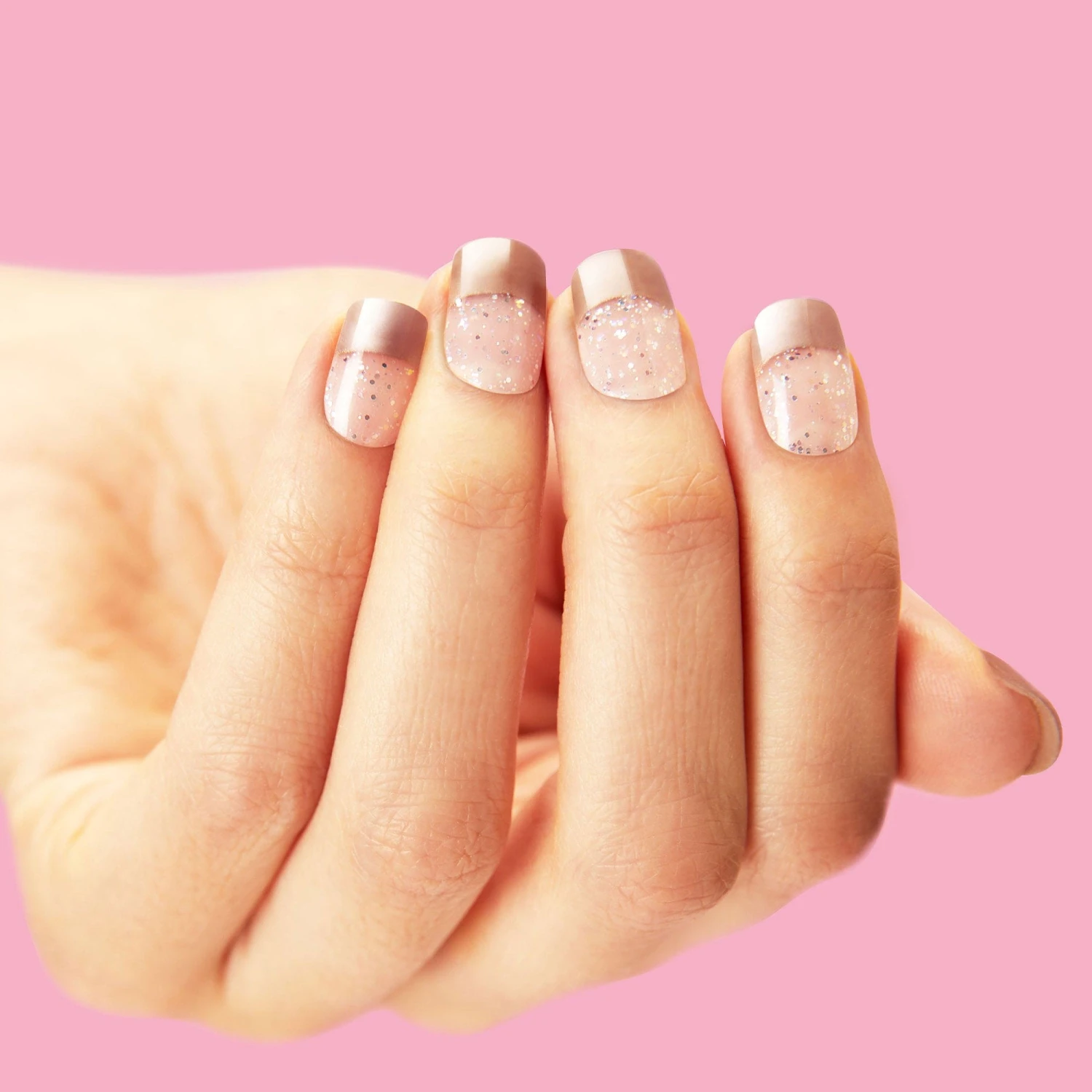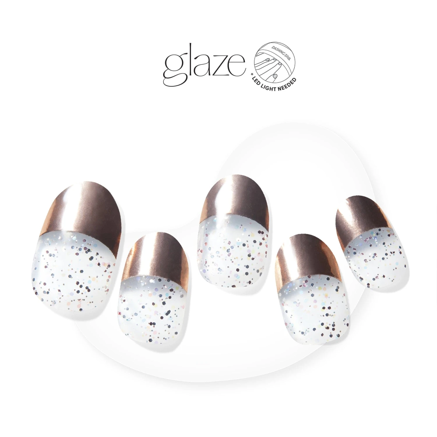You’re so golden! Semi-cured clear & rose gold gel nail strips featuring golden glitter, and a rose gold French tip with mega volume & maximum shine.