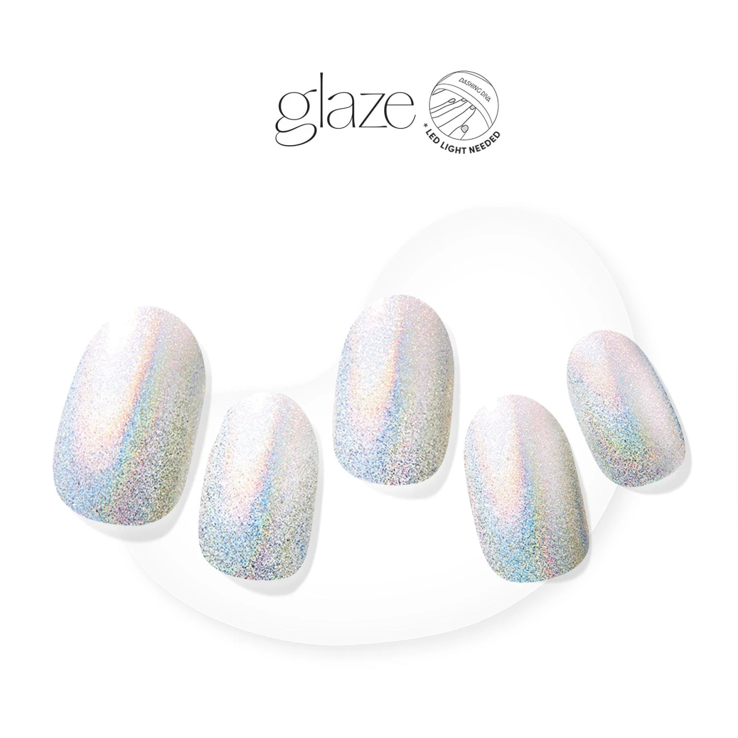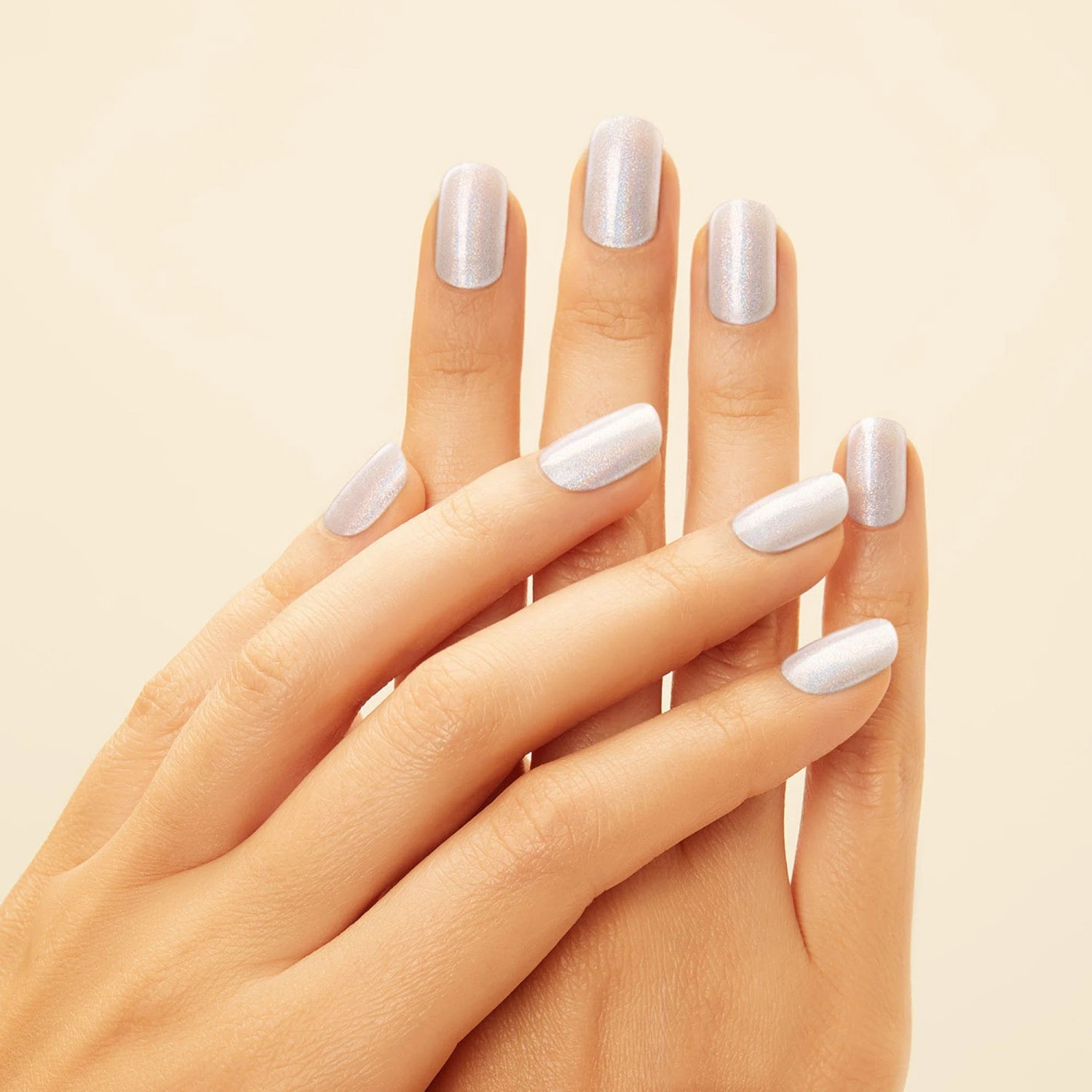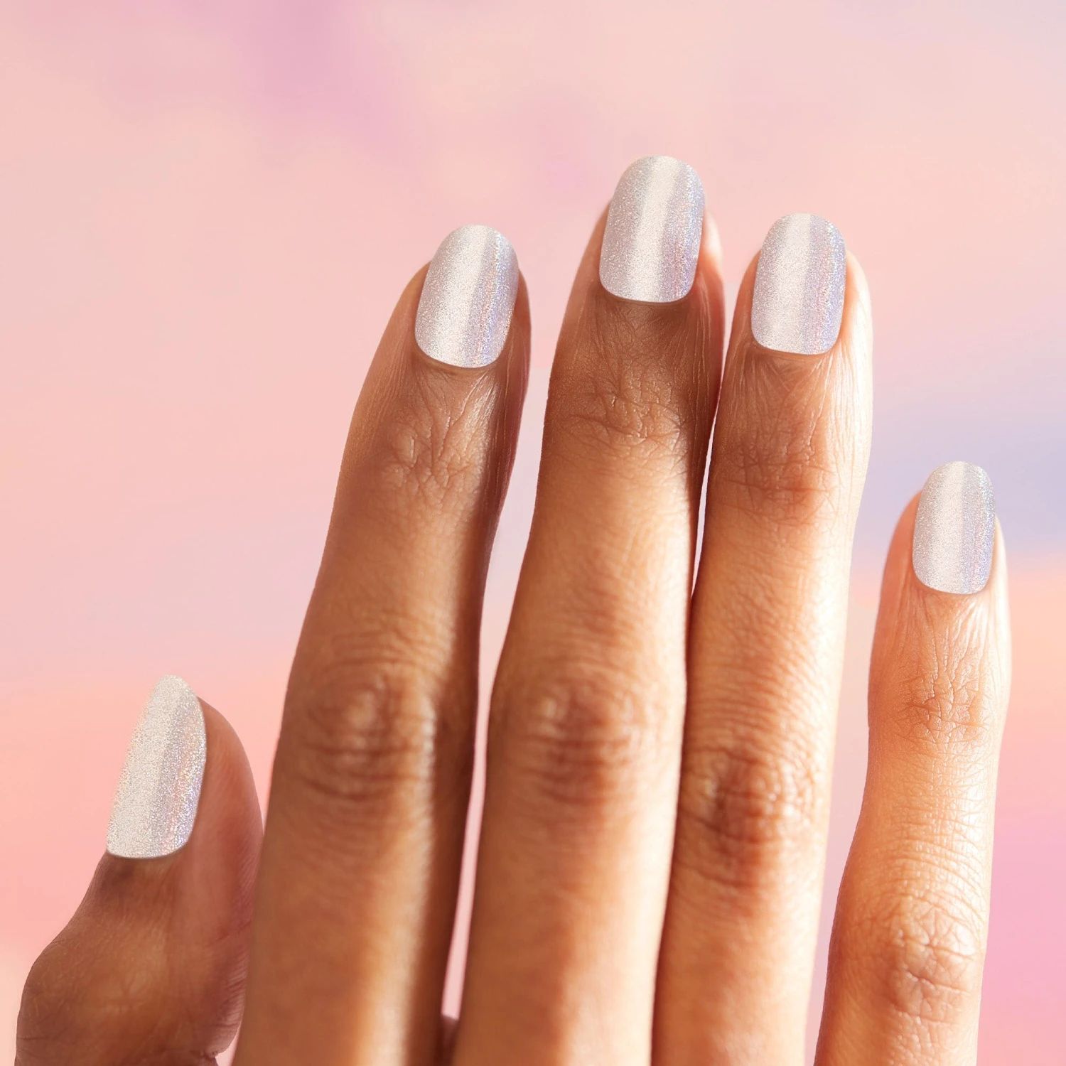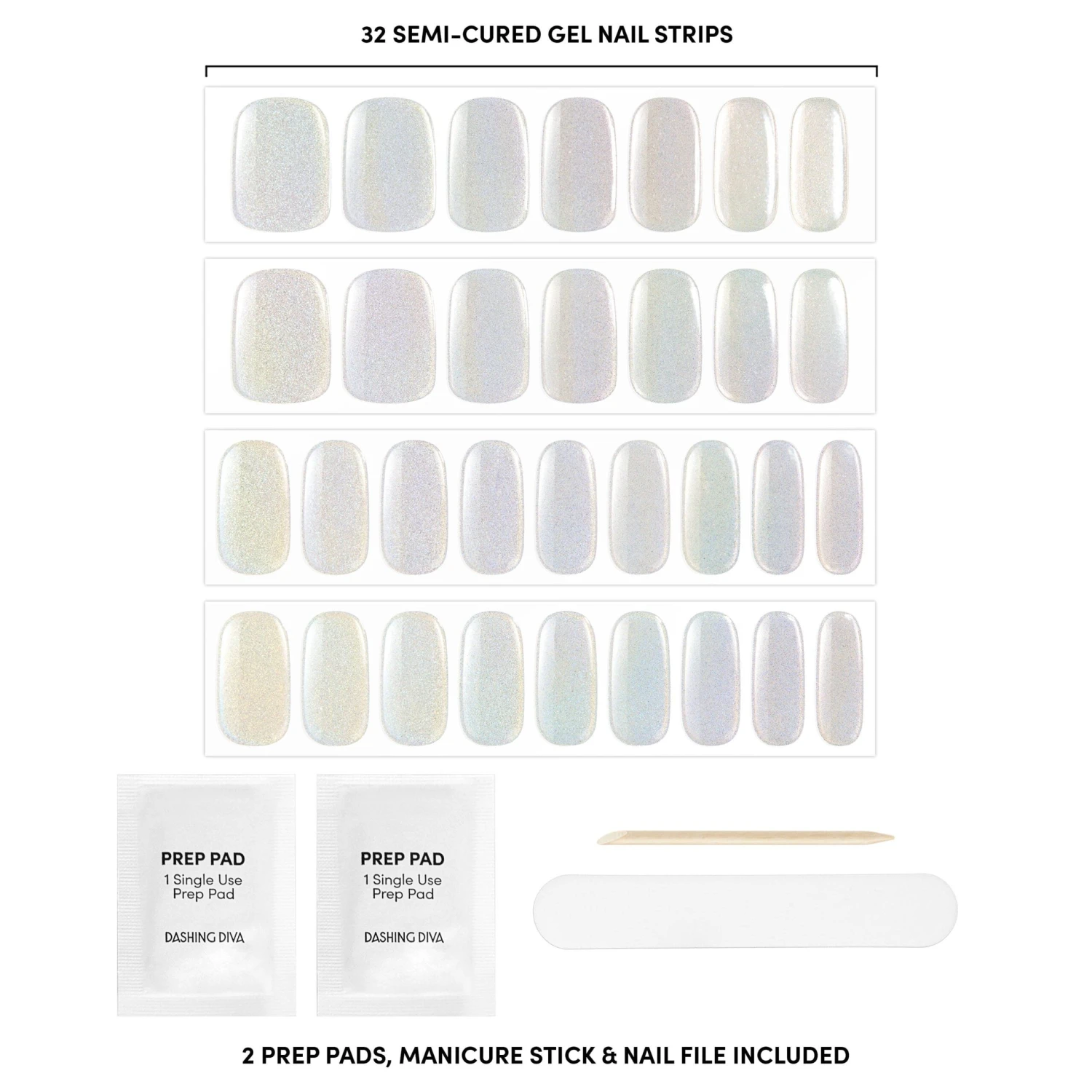 Semi-cured iridescent silver gel nail strips featuring holographic shimmer with mega volume and maximum shine.