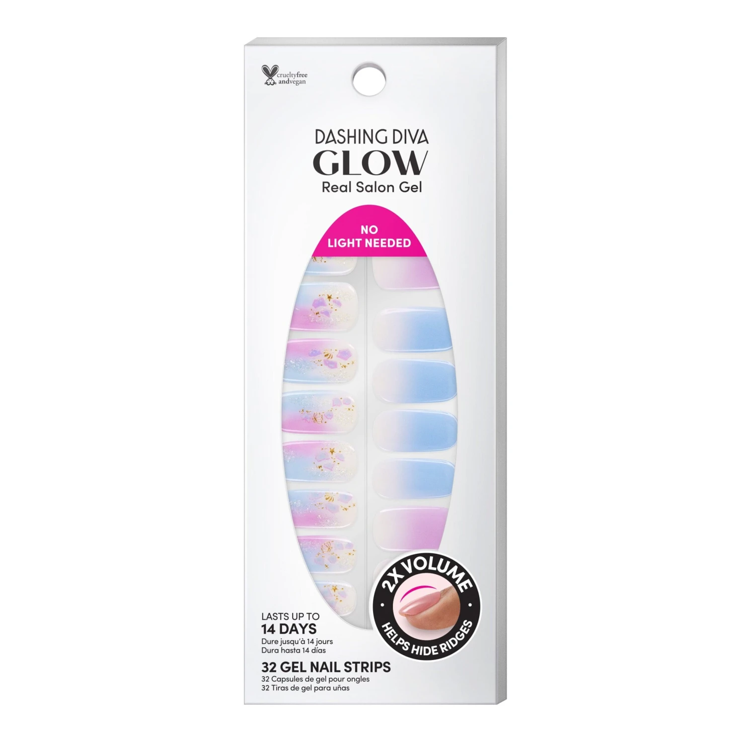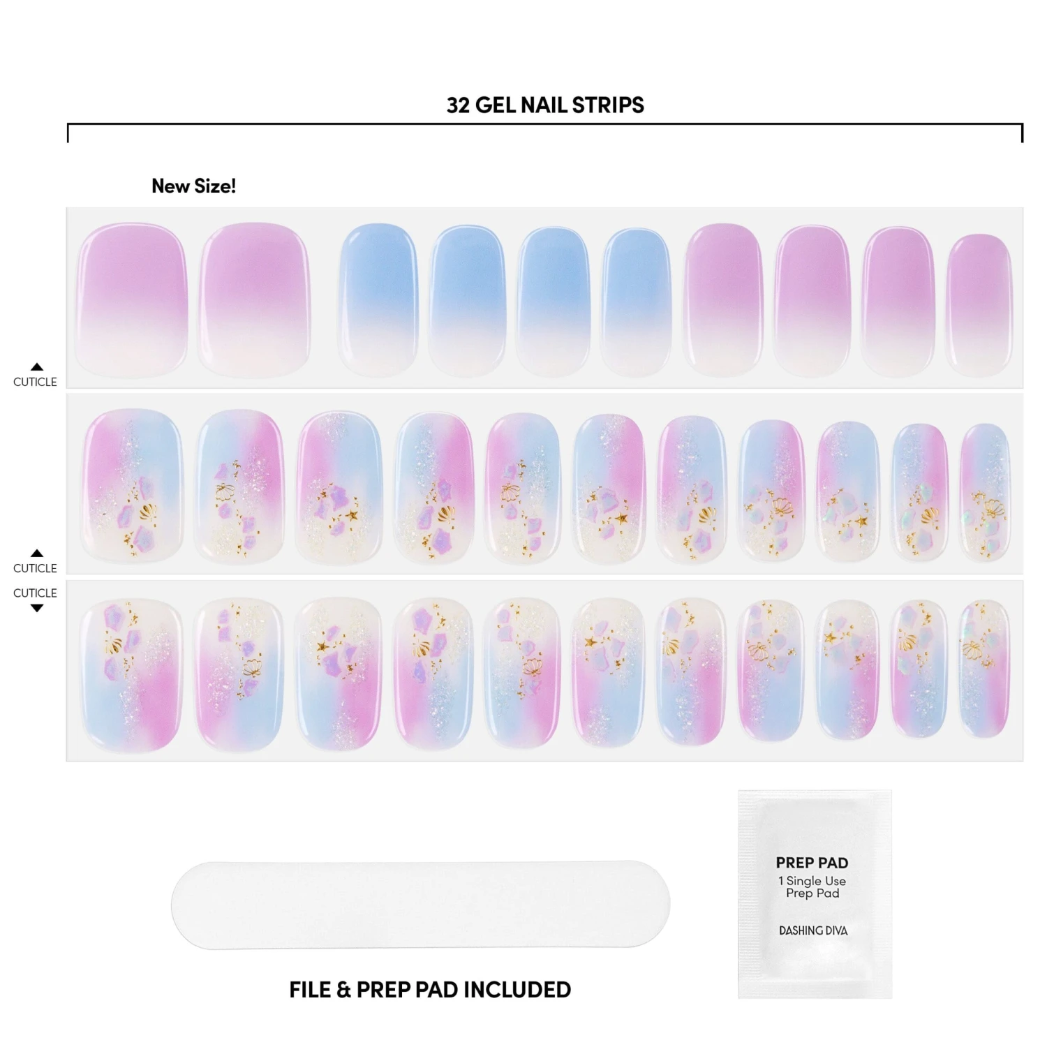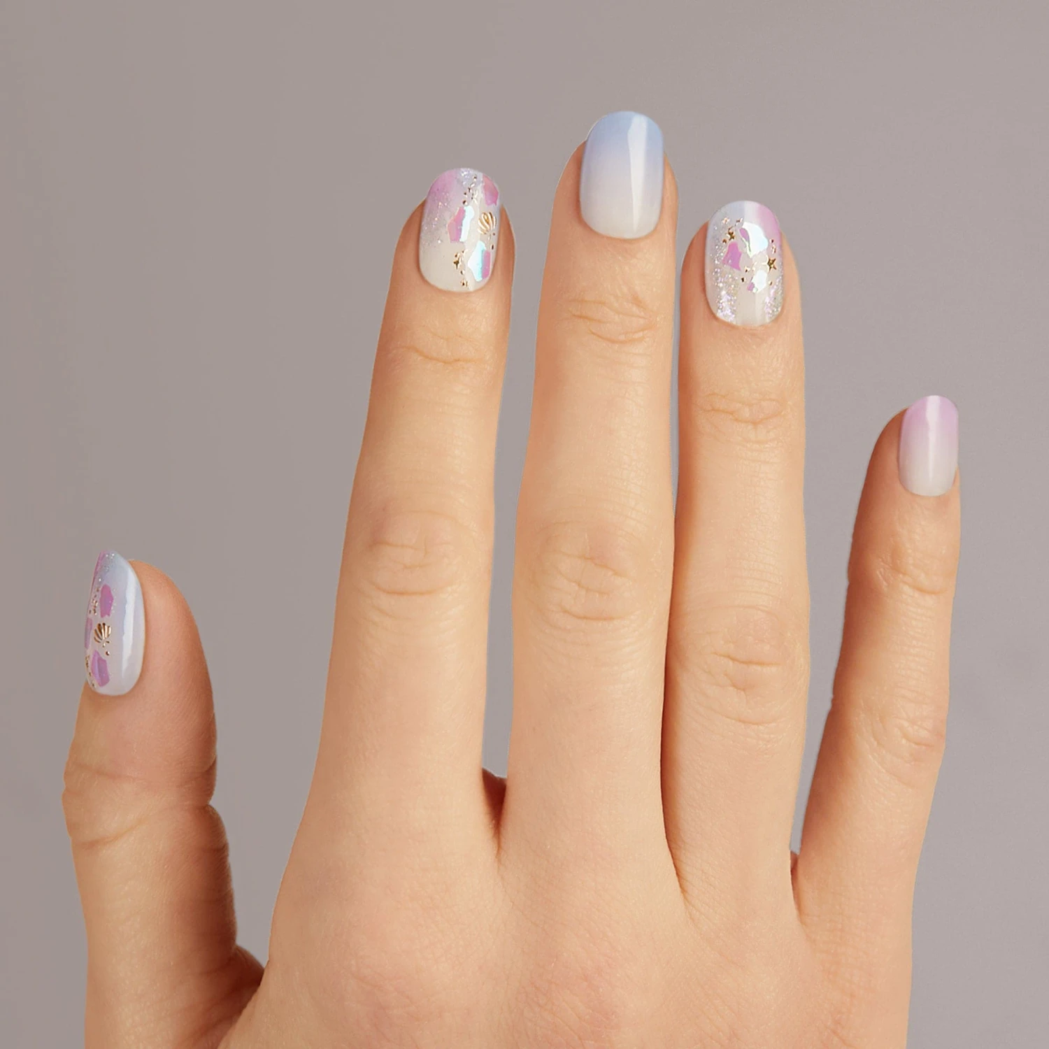 Gradient blue, purple, and off-white gel nail strips featuring gold seashells, iridescent glitter, and iridescent mosaic accents with a double gel formula for an ultra-smooth finish.