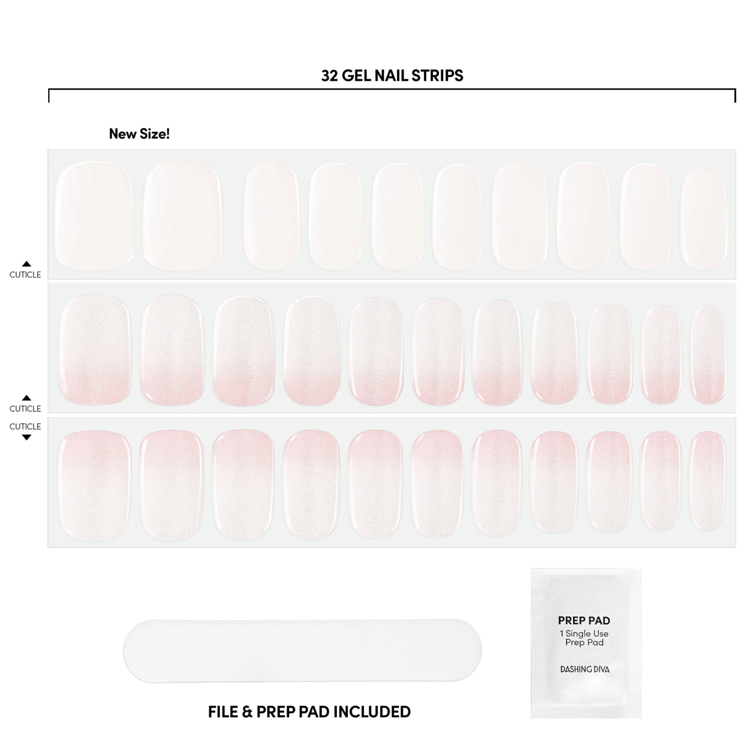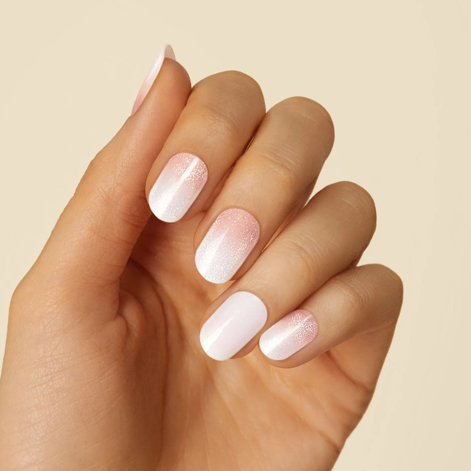 White & pink to white ombré gel nail strips featuring a velvet shimmer with a double gel formula for an ultra smooth finish.
