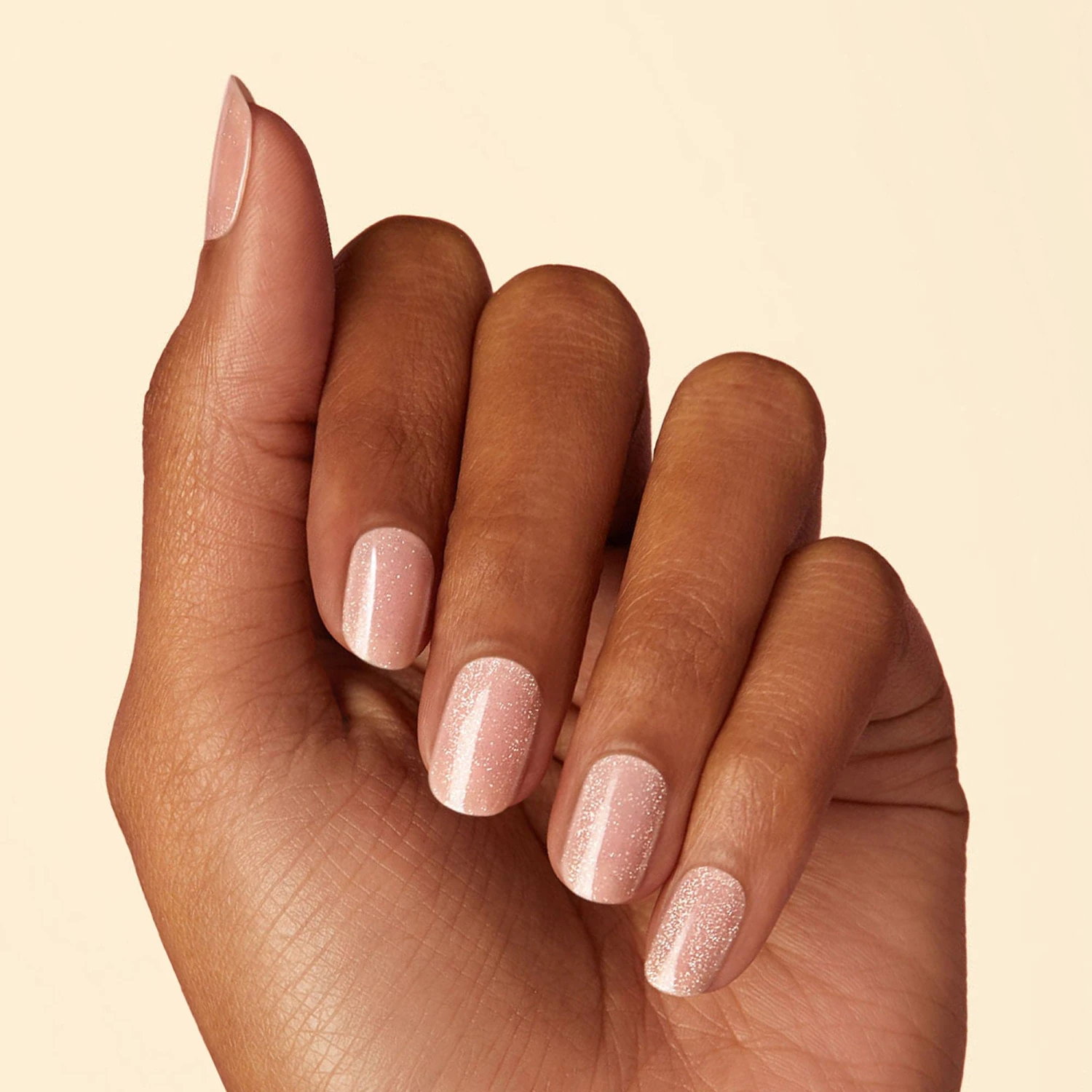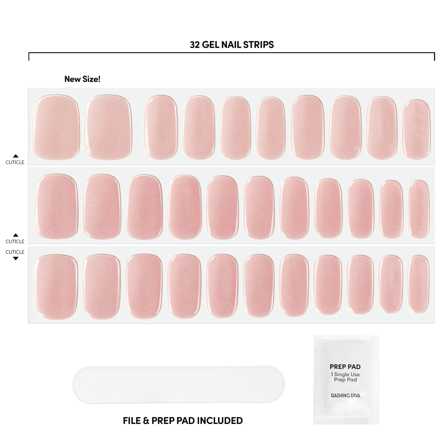 Nude pink gel nail strips featuring velvet shimmer with a double gel formula for an ultra-smooth finish.