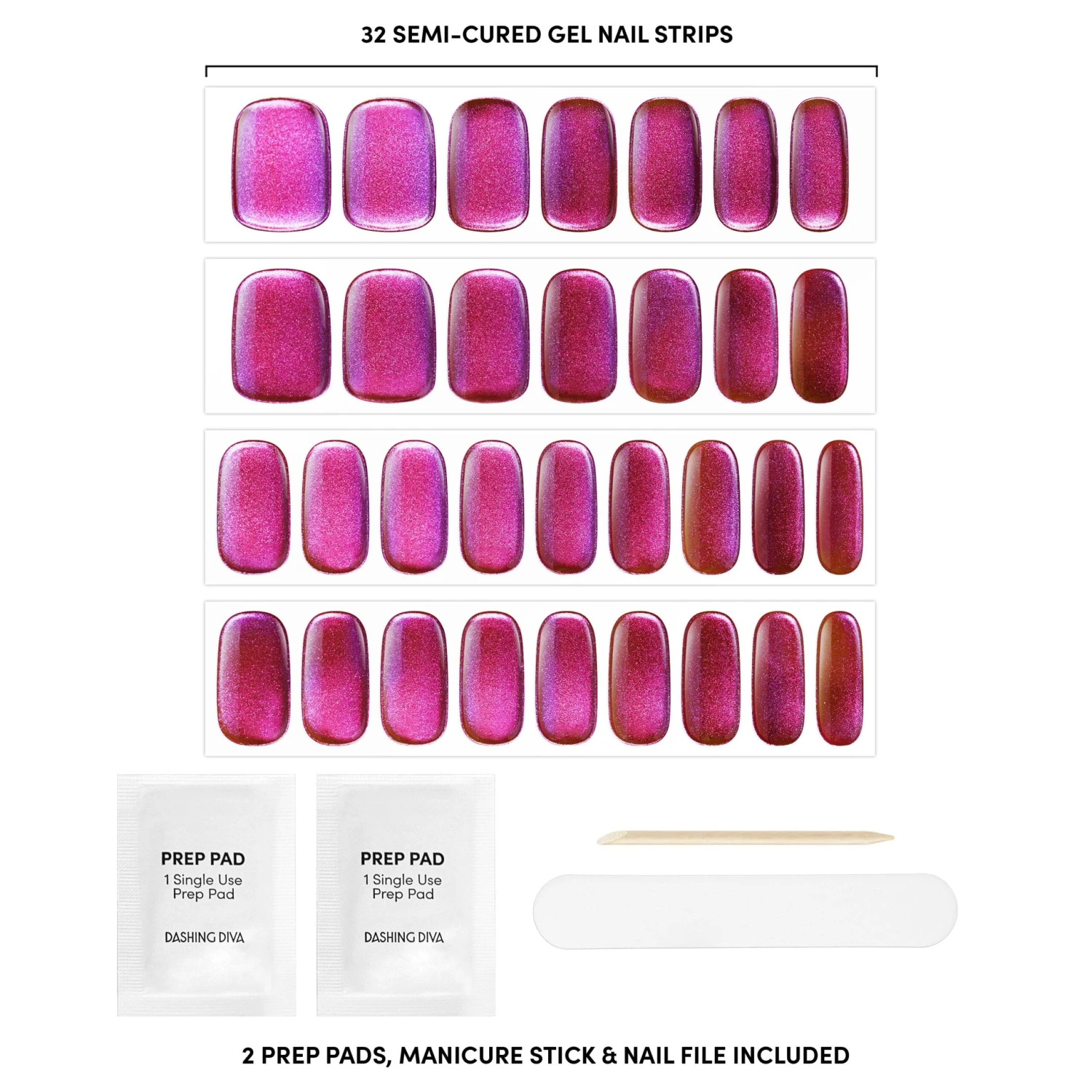 Semi-cured mulberry metallic chrome gel nail strips with mega volume & maximum shine.