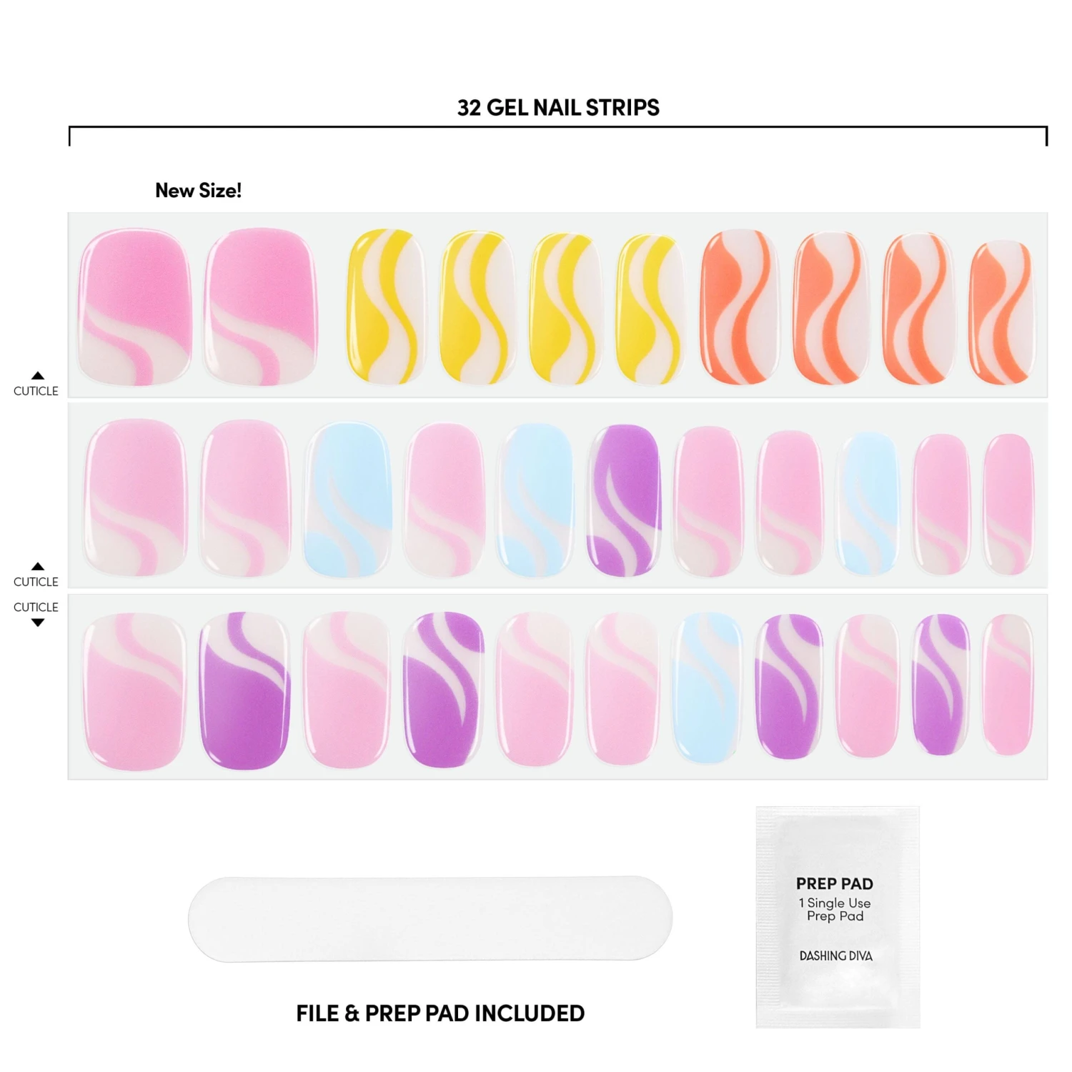 Sheer nude gel nail strips featuring multicolor, pastel abstract swirls with a double gel formula for an ultra-smooth finish.