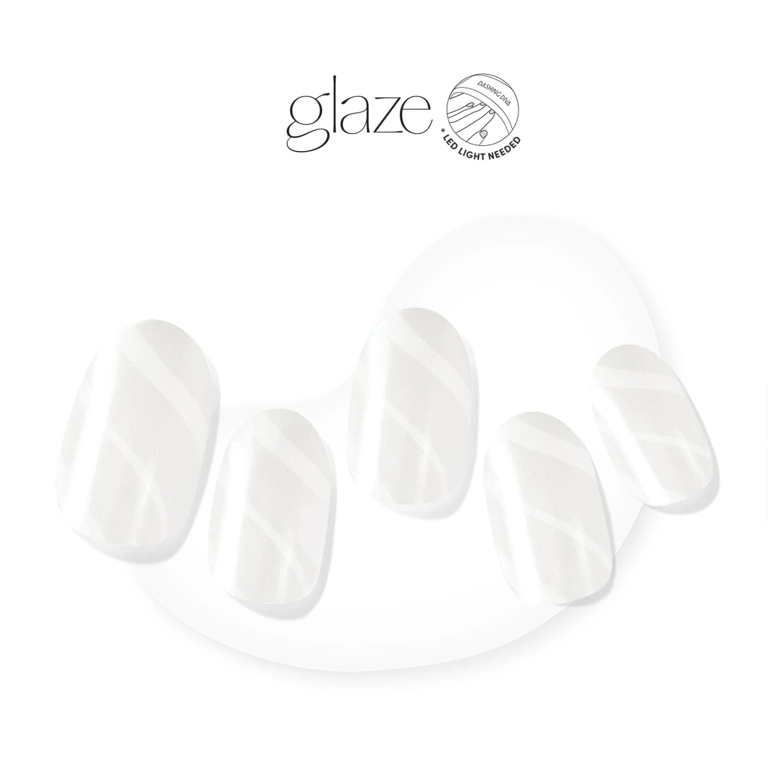 Semi-cured pearly white gel nail strips featuring abstract swirls and a shimmery chrome finish with mega volume & maximum shine.