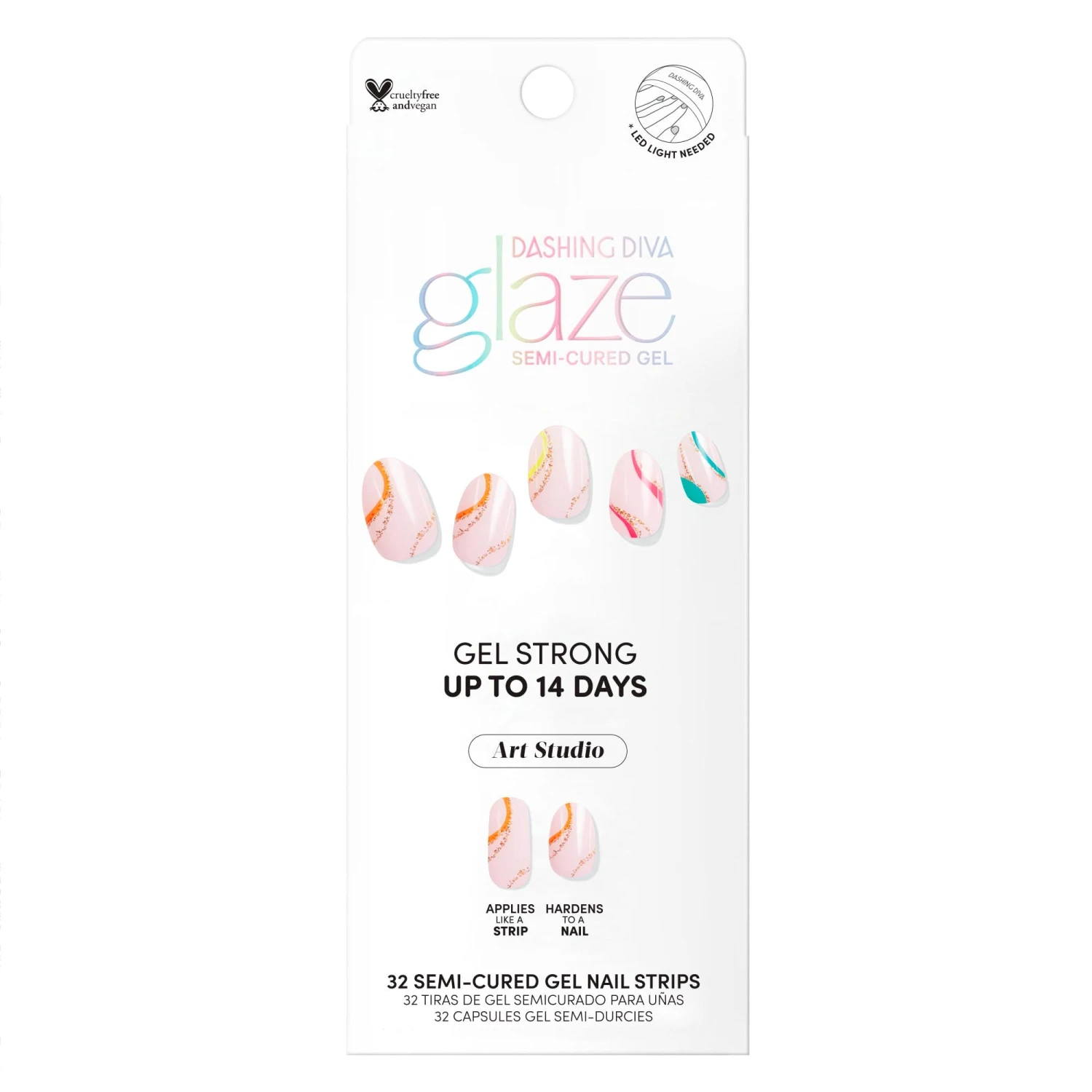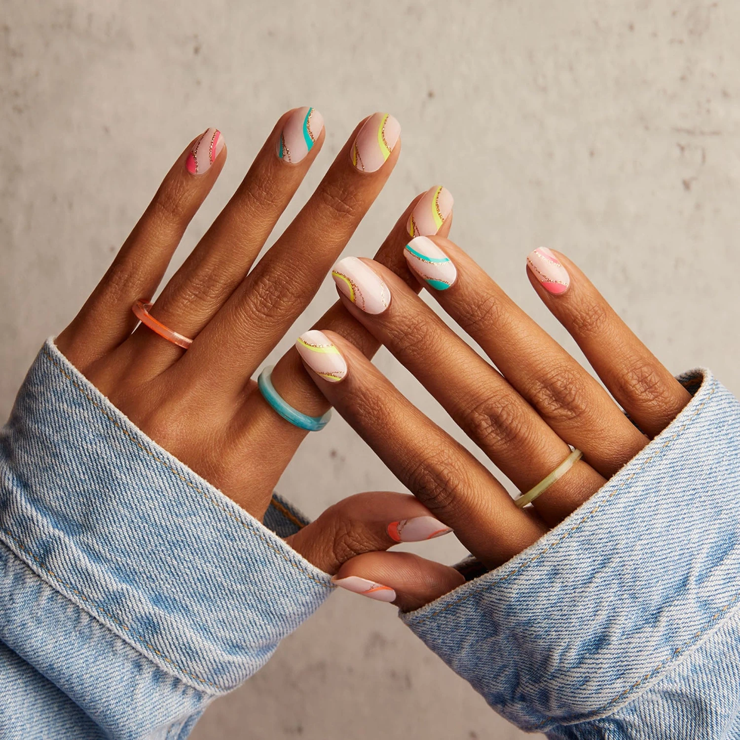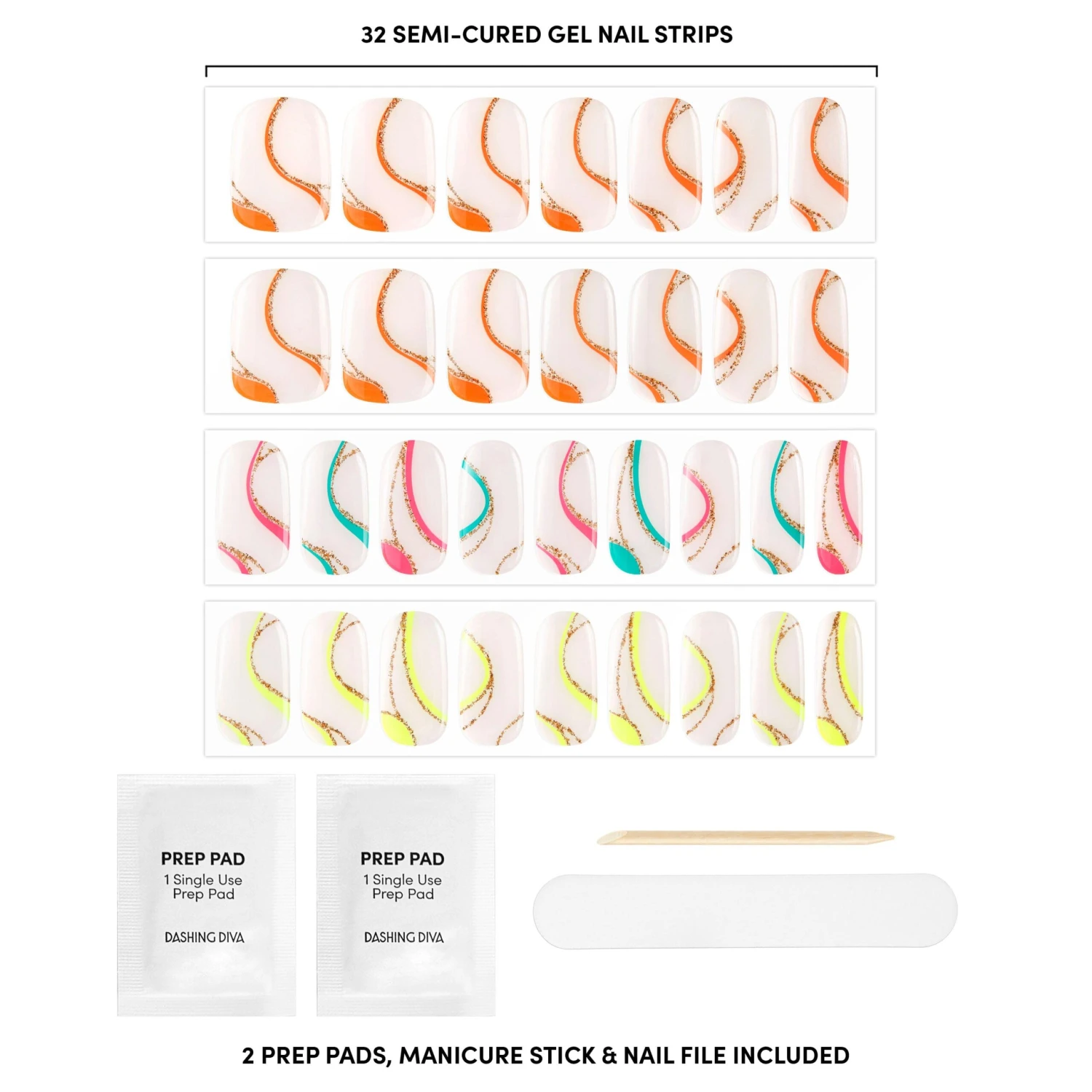 Semi-cured sheer nude pink gel nail strips featuring neon, multicolor swirls & gold glitter with mega volume and maximum shine.